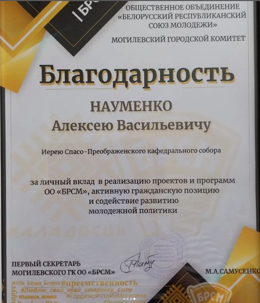 Благодарностью ГК ОО «БРСМ» за личный вклад в реализацию проектов и программ ОО «БРСМ», активную гражданскую позицию и содействие развитию молодежной политики наградили ключаря нашего собора иерея Алексея Науменко, руководителя епархиального отдела религиозного образования и катехизации.