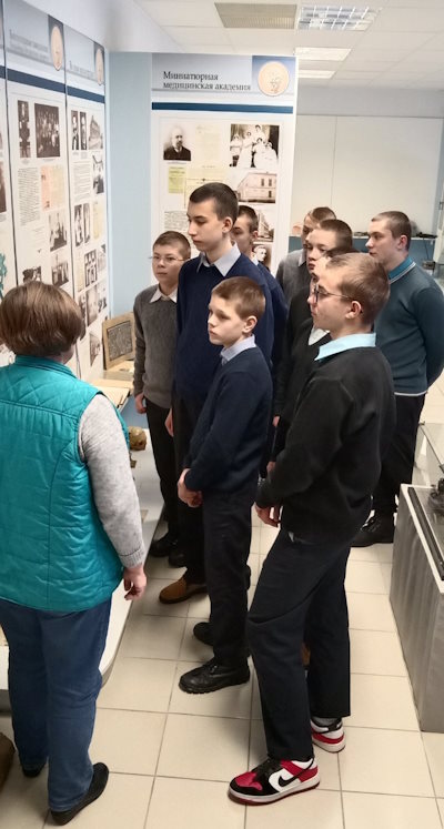 Библиотекарь Н.Н. Панасевич, стоявшая у истоков создания музея, рассказала подросткам много интересного о выдающихся врачах — уроженцах Могилевщины. Открытием для ребят было то, что Могилевщина — родина 450 выдающихся деятелей медицины, 150 из них присвоено звание «Заслуженный врач» (БССР, УССР, РСФСР, Молдавской ССР).