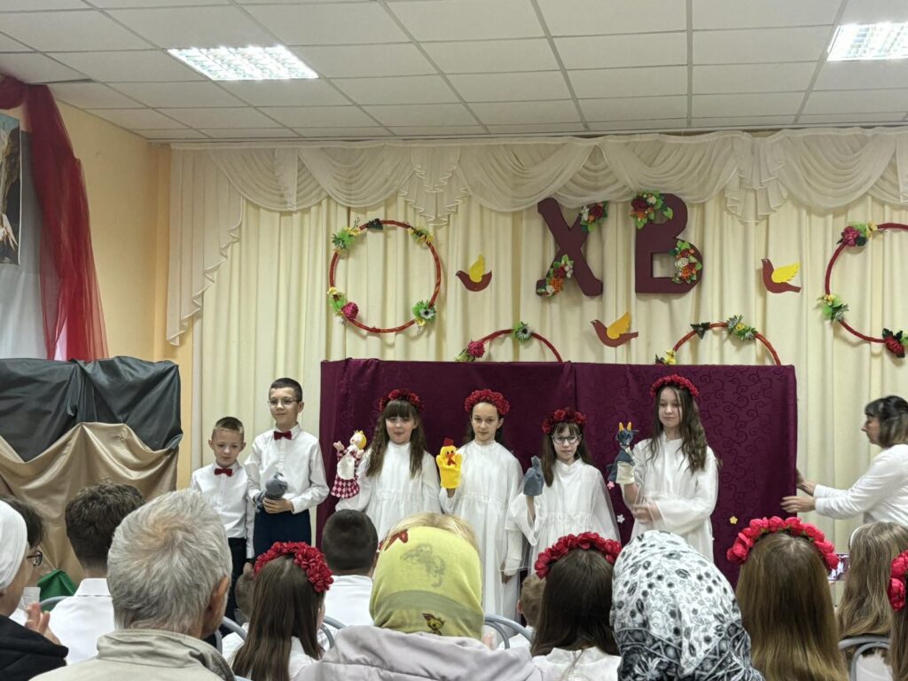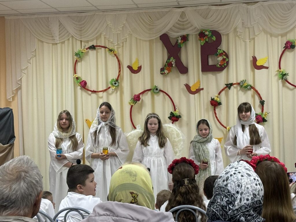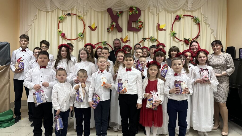 4 мая 2025 г. в неделю святых жен-мироносиц воспитанники воскресной школы храма иконы Божьей Матери «Спорительница хлебов» г. Горки поздравили прихожан с праздником Пасхи.